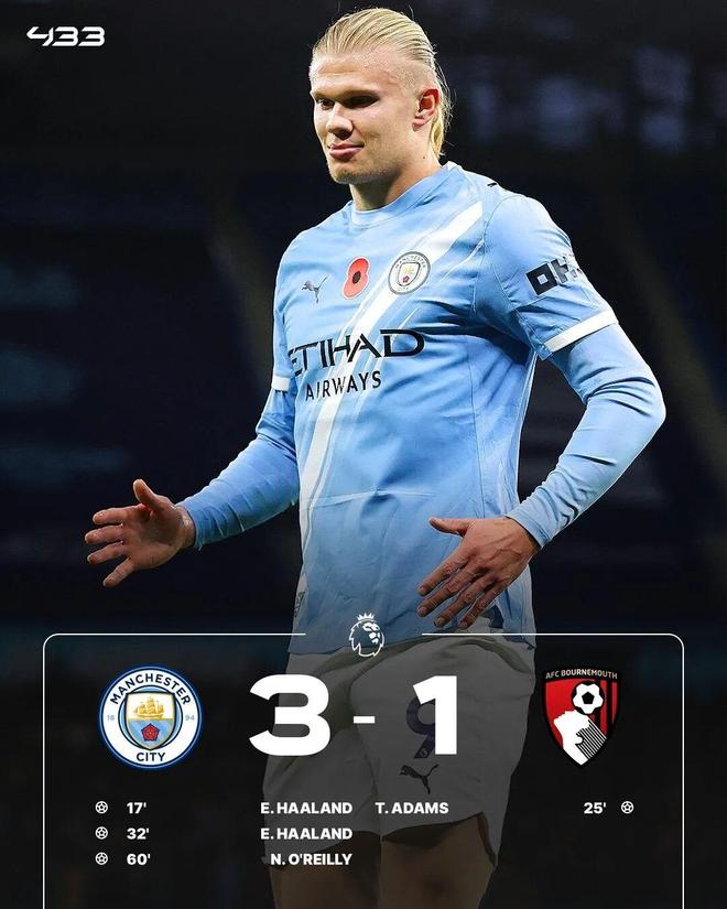 下半场,福登助攻,奥赖利突破禁区,低射破门。曼城最终以3-1击败伯恩茅斯。