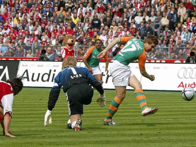 克拉什尼奇和米库、埃尔顿在沙夫的战术板上组成的攻击线是一首流淌的诗。这首诗在2003-04赛季达到了巅峰。克拉什尼奇用13球10助攻的两对答卷为不莱梅戴上了德甲和德国杯的双冠。特别是在慕尼黑的夜晚,他像绿色闪电一样划破了安联球场的夜空,用致命的一击宣告了老王的暂时结局和新王的诞生。