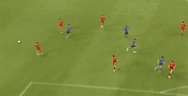 第22分钟,町野修斗弧顶前短传,横滨水手前锋西村拓真靠住防守球员横拉后转身右脚兜射,皮球直入球门右侧死角,日本队3-0领先。