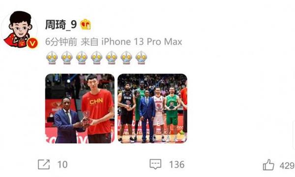 周琦晒入选亚洲杯最佳阵容照片 发了7个奥特曼表情