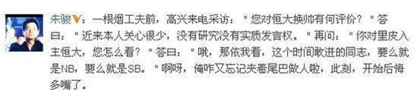 有人问当时上海申花俱乐部投资人朱骏怎么看里皮入主恒大,朱骏发了个微博: