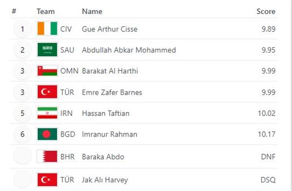 阿曼选手阿尔·哈尔希与土耳其选手巴恩斯皆跑出9秒99的成绩获得铜牌。领奖台站上了两位亚洲运动员。