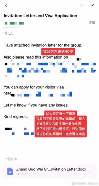 今日张国伟晒出邮件截图,称自己已经收到了国外比赛的邀请函,将于9月底出国参赛。张国伟表示,自己会积极办理签证。