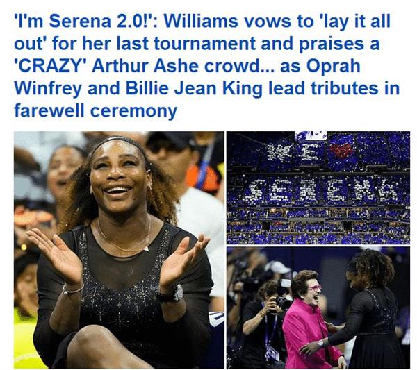 2022年美网对于小威而言就是告别之旅,首轮两个6-3战胜黑山选手科维尼奇,而小威获胜后,美网组委会特地在现场为小威举办了告别仪式,在这个特殊日子里、特殊时刻中,小威感谢了现场观众,也再次表示,自己是时候离开了。