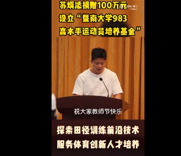 9月10日,据暨南大学官方消息,暨南大学体育学院教授苏炳添捐赠100万元,设立“暨南大学983高水平运动员培养基金”,用于探索田径训练前沿技术,服务体育创新人才培养。