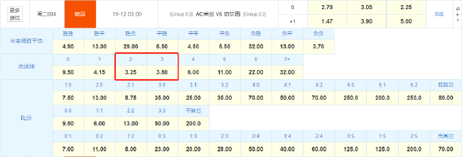 北京时间10月12日凌晨,欧冠小组赛第3轮正式打响,AC米兰将坐镇圣西罗迎战切尔西。目前两队同积4分位列E组的第二三名,本场赛果将直接决定小组的出线形势。目前竞彩官方开出了相关指数,AC米兰赢球1赔2.75,平局1赔3.05,切尔西客胜1赔2.25,客场作战的蓝军占据一定优势。