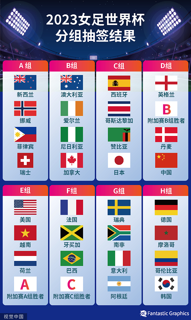 根据抽签结果,中国女足和英格兰、丹麦以及一支待确定的附加赛球队被分到D组。