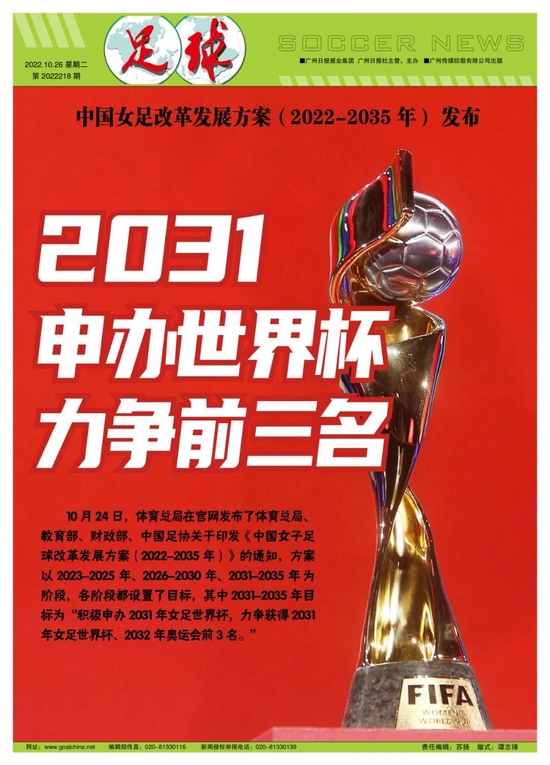 特约记者朱兰报道 10月24日,体育总局在官网发布了体育总局、教育部、财政部、中国足协关于印发《中国女子足球改革发展方案(2022-2035年)(下简称方案)》的通知,方案以2023-2025年、2026-2030年、2031-2035年为阶段,各阶段都设置了目标,其中2031-2035年目标为“积极申办2031年女足世界杯,力争获得2031年女足世界杯、2032年奥运会前3名。”