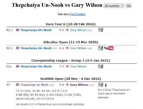 接下来加里.威尔逊打出单杆64分,超分球没有打进,塔猜亚顶住压力,打出单杆68分完成清台扳回一局,但是加里.威尔逊轰出单杆115分锁定胜利,职业生涯第三次打进决赛。
