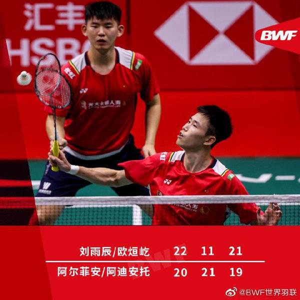 在男子双打半决赛中,刘雨辰/欧怡挑战印度尼西亚著名的阿尔弗兰/阿利安托。第一场比赛双方竞争激烈,比分交替领先。12-15后,刘雨辰/欧璇获得4分,阿尔弗兰/阿利安托获得20平。关键得分刘雨辰/欧璇抓住机会,以22-20获胜。