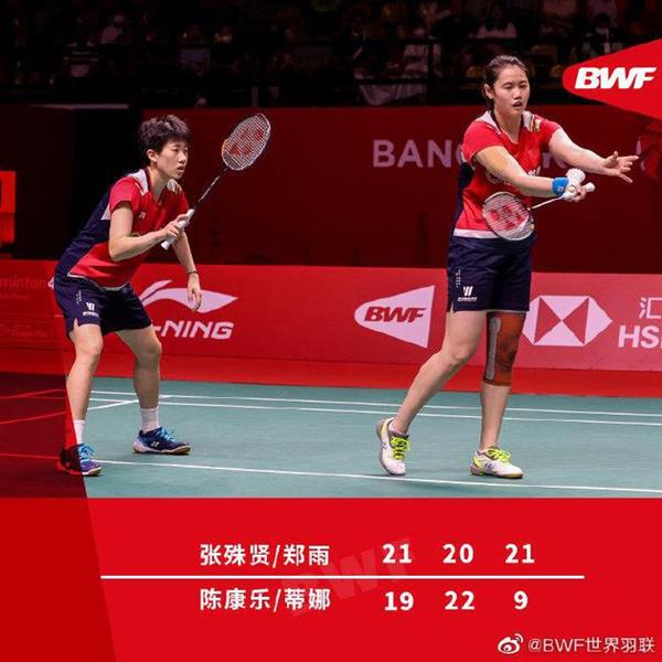 2022年世界羽毛球联合会年终总决赛在泰国曼谷举行。在小组赛的最后一轮比赛中,混双郑思维/黄雅琼以三连胜获得小组第一名。王一律/黄东平1-2输给泰国德差波/沙西丽,三战一胜两负被淘汰。女双陈清晨/贾一凡2-0获得三连胜,占据小组第一,张殊贤/郑宇2-1获得第二胜,获得小组资格。