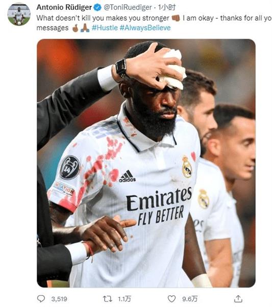 西班牙记者何塞·桑切斯透露,吕迪格的伤口缝了20针,他将在今天和明天进一步检查,以确定是否有骨折。吕迪格在社交媒体上发布了他受伤的照片,并说:“那些杀不死你的人会让你更强大!好吧,谢谢你的祝福。”之后,吕迪格在飞机上发布了一张头上裹着纱布的照片,并开玩笑说:“我还活着。”
