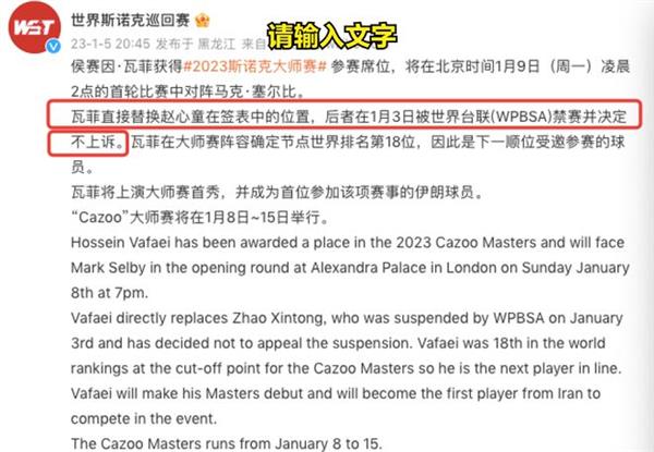 根据世界台湾联合会的最新消息,赵新通已经做出了最新的决定,没有上诉他的禁赛处罚。世界台湾联合会说:“侯赛因·瓦菲在2023年斯诺克大师赛中获得席位,将于北京时间1月9日(周一)凌晨2点对阵马克·塞尔比。瓦菲直接取代了赵约表中的位置,后者于1月3日被世界台湾联合会取代(WPBSA)禁赛并决定不上诉。瓦菲在世界大师赛阵容中排名第18位,因此她是下一个被邀请参加比赛的球员。”