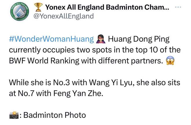 近日,中国羽毛球混双奥运冠军黄东平成为外界关注的焦点。据悉,全英公开赛官方平台对黄东平在东京奥运周期和巴黎奥运周期的表现赞不绝口。他们提到,黄东平目前在世界羽毛球联合会混双项目中与两位不同的男选手排名世界前十。其中,与奥运冠军王一律一起排名世界第三,与新星冯彦哲一起排名世界第七,是世界羽毛球混双的传奇人物之一。对此,网友们不仅为黄东平感到骄傲,还惊叹于她在混双项目中的超强综合实力。