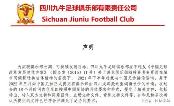 据最新消息,中国A的四川九牛俱乐部最近发布了他们将退出职业联赛的官方声明,四川九牛之所以退出,是因为足协出尔反尔。