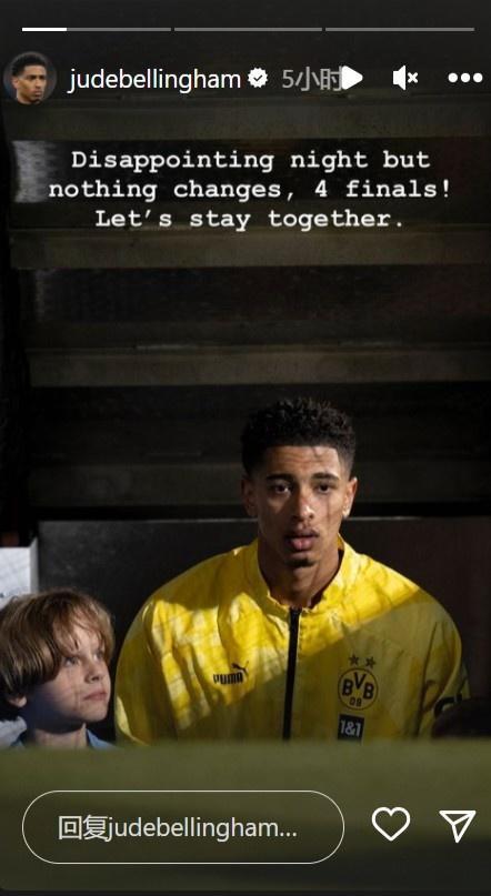 赛后,贝林厄姆更新社媒鼓励球队,他写道:“令人失望的夜晚,但什么都没有改变,还有4场决赛,让我们团结一致!”