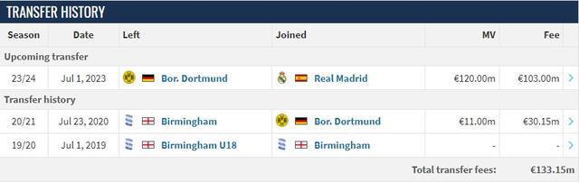 三年前的夏天,多特将贝林厄姆从伯明翰引进,当时多特花了3015万欧元为17岁的贝林厄姆支付转会费。