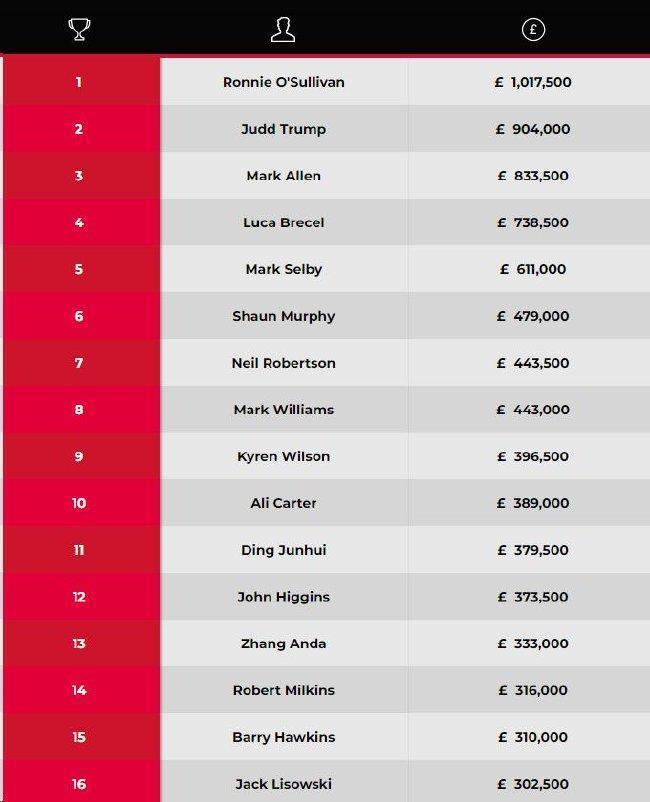 罗尼-奥沙利文在WST官网今年最后一次更新的最新排名中再次“躺赢”,以1017500英镑继续位居榜首,并在20个月内继续位居世界第一。贾德-特鲁姆普在113500英镑后排名第二。