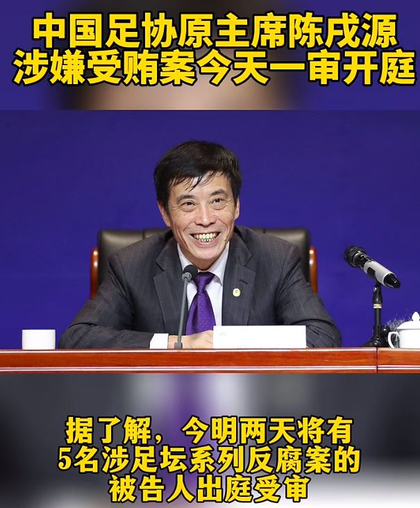 据媒体报道,中国足协前主席陈戌源涉嫌受贿,在湖北省黄石市中级人民法院审理。据了解,今天和明天将有五名被告参与足球系列反腐案件。