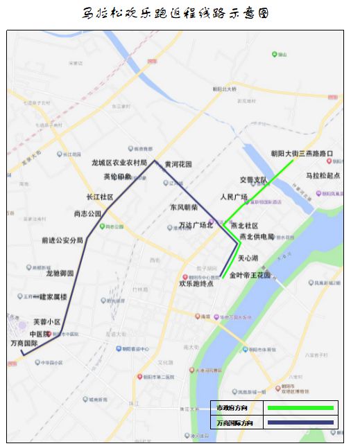 经八里堡村委会、中医院、芙蓉社区、海河社区、一建家庭建筑、龙驰御园、前进公安分局、富祥药业、尚志公园、长江社区、英伦印象、淮河新村、龙城农业农村局、黄河花园、朝柴社区(南园)、从东风朝柴、万达广场北、郡湖城、人民广场、交警支队、龙城大桥等21个站点到比赛起点。