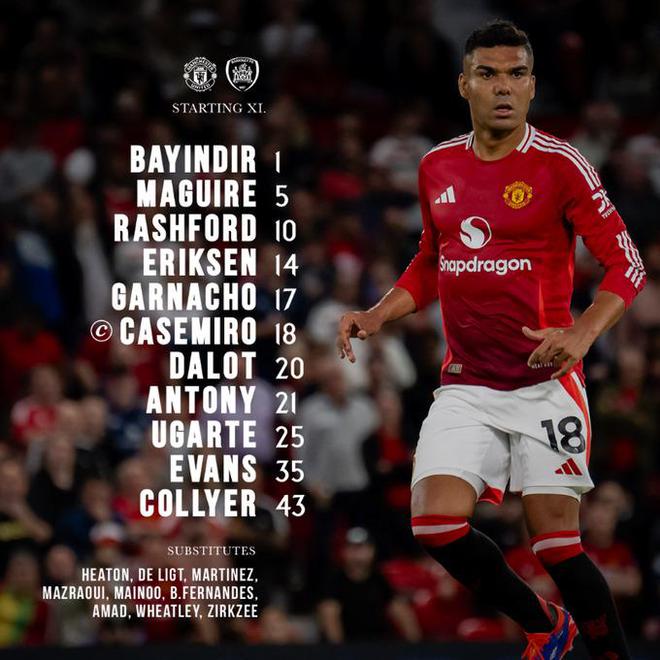 首发:巴因迪尔、马奎尔、拉什福德、埃里克森、加纳乔、卡塞米罗、达洛特、安东尼、乌加特、埃文斯、科利尔