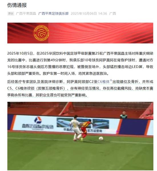 十月六日,广西平果足球俱乐部发布伤情报告: