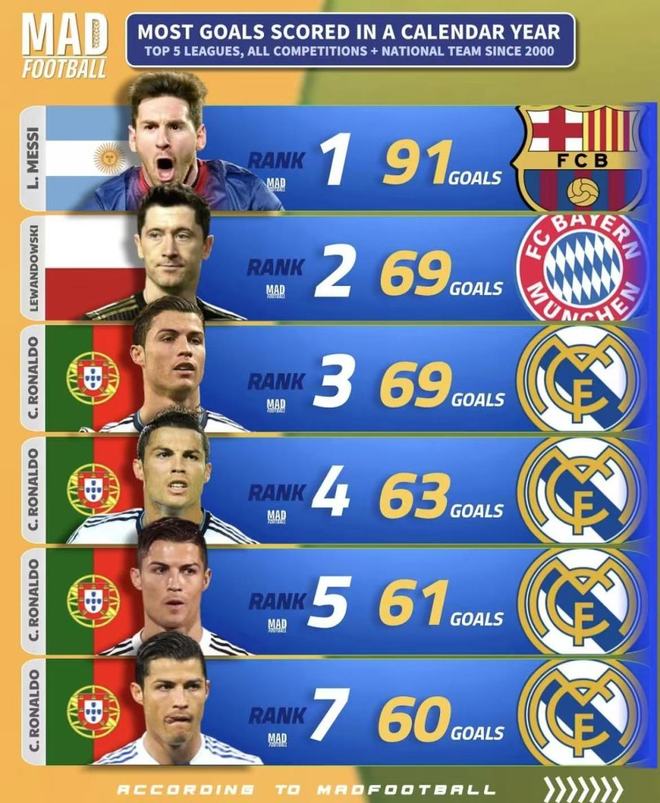 近日,MAD FOOTBALL “自2000年以来,单个自然年进球记录”已经发布。最引人注目的数据是:2012年梅西91球高挂天花板,2013年C罗和2021年莱万各69球紧随其后;更重要的是,梅西上榜6次(场均63球),在出现次数和平均值-18个入围记录中。、C罗5次(场均62球)、莱万三次(平均每场56.7球)。这不是某一年的爆发,而是谁能把高产变成习惯。(截至北京时间2025年9月20日)