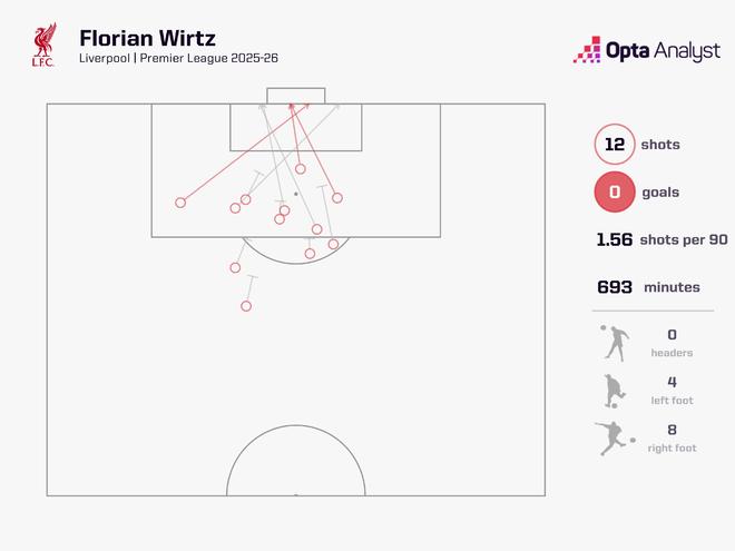 维尔茨英超射门+创造机会次数达28次,但进球、助攻均为零