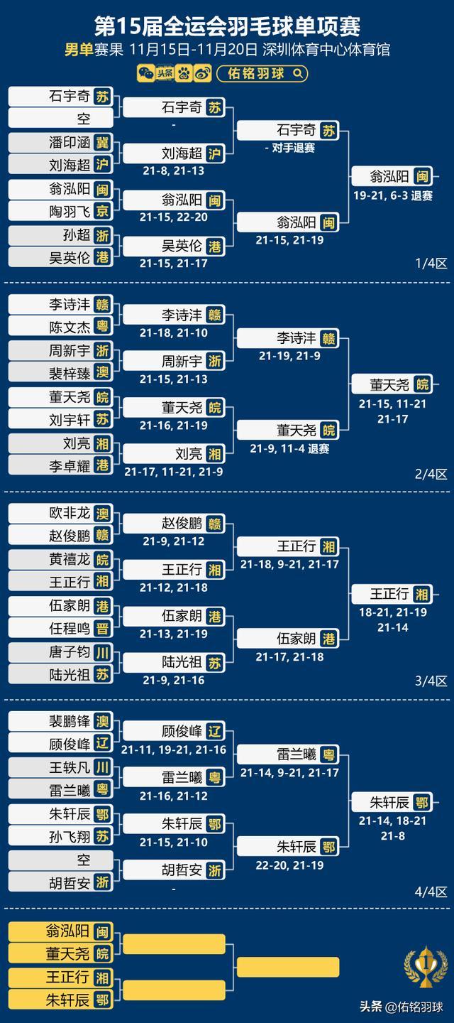 11月17日,第十五届全运会羽毛球项目结束1/4决赛的争夺,各单项4强名单出炉。
