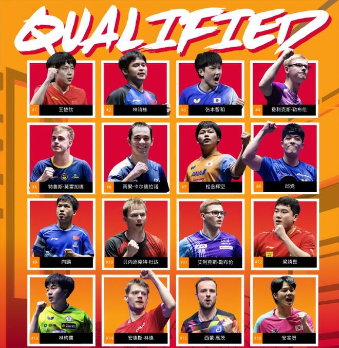 入选男单的球员有王楚钦、林诗栋、雨果、张本智和、费利克斯.勒布伦、松岛辉空、莫雷加德、邱党、杜达、向鹏、林德、林昀儒、艾利克斯.勒布伦、梁靖崑、安宰贤、西蒙.高茨。男单16位球员名单全部出炉。与两个星期前公布的名单相比,增加了艾利克斯.勒布伦、西蒙.高茨、安宰贤。