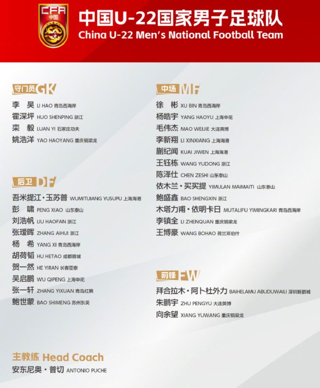 ·U22国足由安东尼奥·普切挂帅将于12月7
