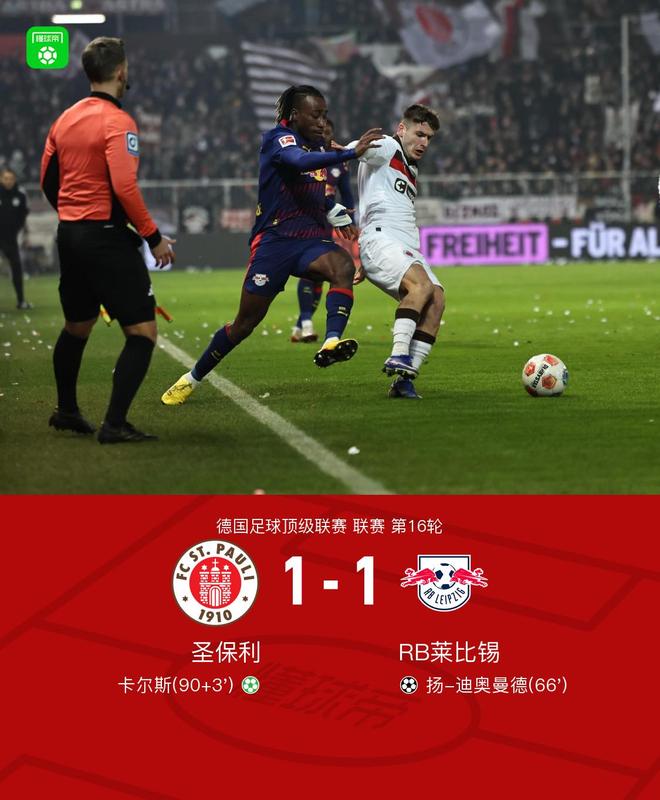 北京时间1月28日,德国足球甲级联赛第16轮,圣保利主场迎战RB莱比锡。扬-迪奥曼德在RB莱比锡领先进球;在补时阶段,卡尔斯主罚点球,帮助圣保利扳平比分。最后双方1-1战平。