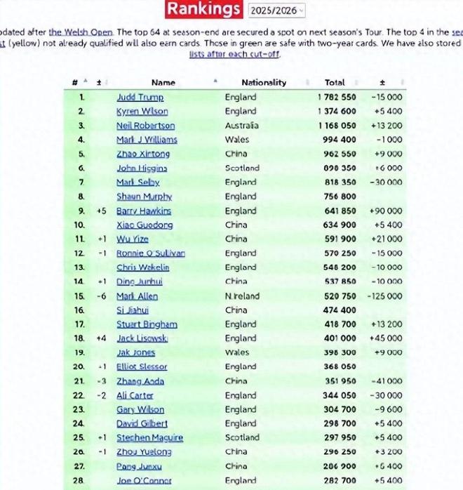 赵心童依然稳居世界第五,牢牢把握着“中国一哥”的位置。