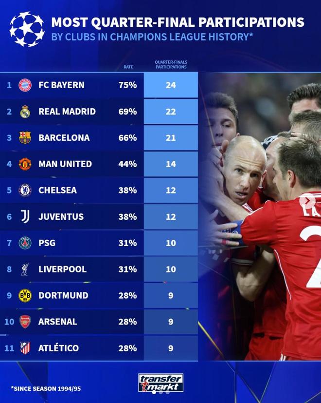 北京时间3月20日,在本赛季欧冠8强全部出炉之后,德转统计出了1994-95赛季至晋级欧冠8强次数最多的11家俱乐部,拜仁慕尼黑'>拜仁慕尼黑以24次高居第一,皇家马德里22次第二,巴塞罗那21次第三。