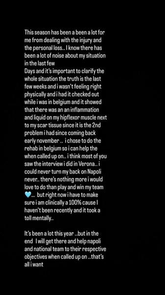 即便如此,卢卡库也只是在社交媒体上发表了一份声明,称他现在正在受到伤病的影响,他选择在比利时接受治疗,以便在未来更好地帮助球队。他甚至说:“我永远不会抛弃那不勒斯。没有什么比为球队而战,赢得胜利更令人向往的了。”他曾经对国际米兰说过类似的声明,但最终他选择了抛弃国际米兰,拒绝了球队的转会,但现在轮到那不勒斯了。