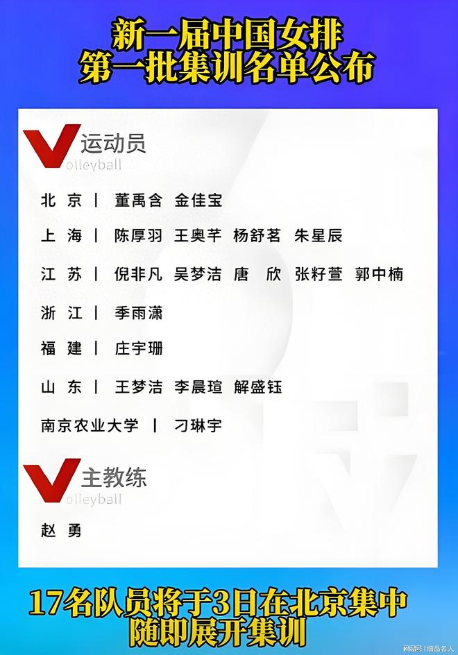 新一届中国女排集训名单于2026年4月2日公布,共有17名选手入选,其中3名二传。
