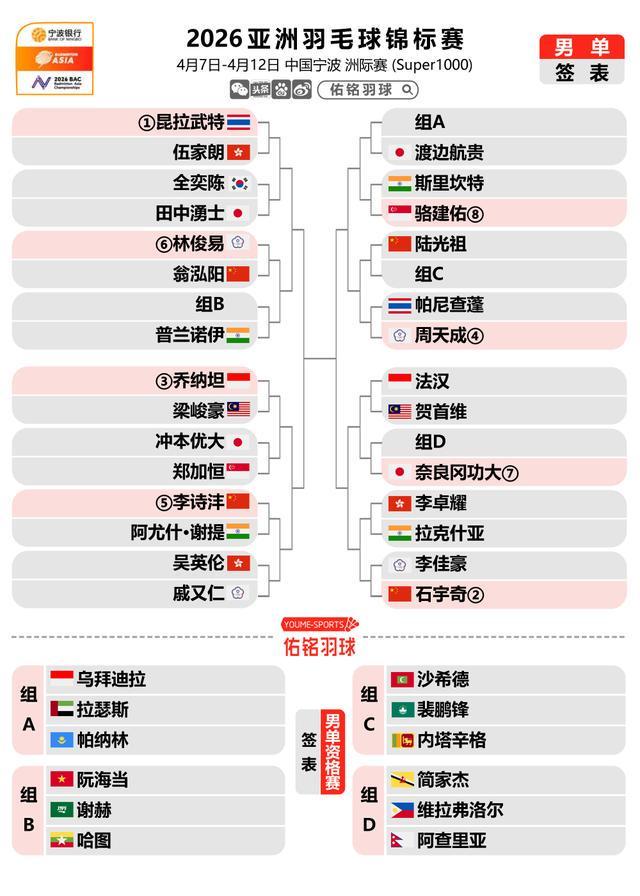 4月6日,2026年亚洲羽毛球锦标赛更新了签表和赛程。除了男单,很多单项都有选手退出比赛,尤其是主场作战的中国羽毛球队。女单陈雨菲和混双蒋振邦/魏雅欣因伤退出比赛,不同程度地调整了他们的签表。由于兰基雷迪的肩伤,男双印度黑塔也被迫退出比赛,导致100%组合的潜在对手发生变化。
