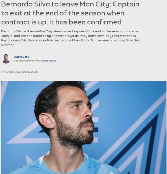据天空体育报道,曼城队长贝尔纳多-席尔瓦将在本赛季结束后离开球队。这位31岁的球星在效力曼城的9年里,已经和球队一起赢得了6个英超冠军和1个欧冠冠军,但他将在本赛季合同到期后自由转会。