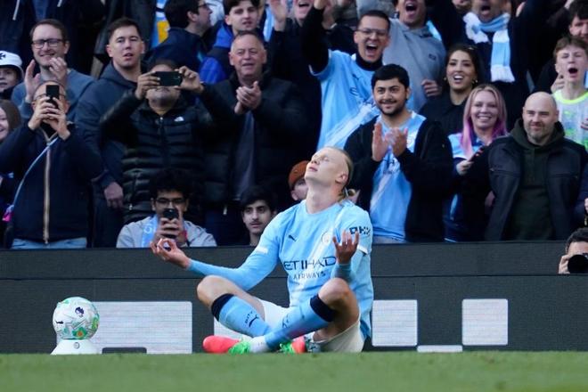 在打进反超比分后,哈兰德做了一个标志性的庆祝动作。