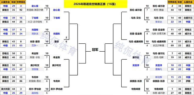 北京时间4月24日早,2026年斯诺克世锦赛结束了正赛第6个比赛日的争夺,目前16强正式出炉!本人整理了最新签表,如下图所示。4名中国球员晋级16强,4月24日晚上9点半,丁俊晖与赵心童迎来“中国德比”,此役必将万众瞩目!下面带来详细信息。