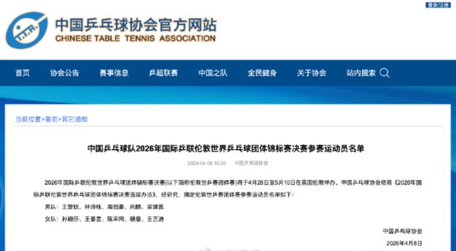 4月8日,中国乒乓球协会依照《2026年国际乒联伦敦世界乒乓球团体锦标赛决赛选拔办法》,确定伦敦世乒赛团体赛参赛运动员名单如下: