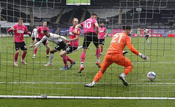 63分钟时,斯旺西扳平比分。在接到左路任意球挑传后,卡班戈后点头球回摆,惠特克小禁区中路头球射门。尽管德比郡门将将球捞了出来,但皮球现已彻底越过了门线。