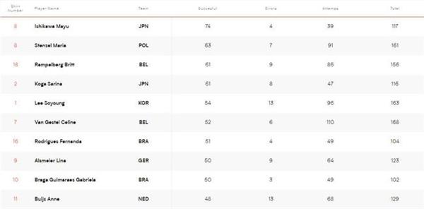 二传排行榜,邦加特-布里特158次成功,高居榜首。比利时队的范德维弗伊尔卡134次成功,位列第二。诺维卡-朱莉娅129次成功第三。中国队姚迪84次成功位列第七,刁琳宇35次成功位列第18。