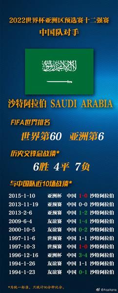 国足与沙特比武17次,国足6胜4平7负略处劣势。国足与沙特世预赛比武5次4胜1平坚持不败,最近一次世预赛是1997年的10强赛,国足1-0、1-1对沙特坚持不败。两边最近一次比武是2015年的亚洲杯,国足1-0小胜沙特。
