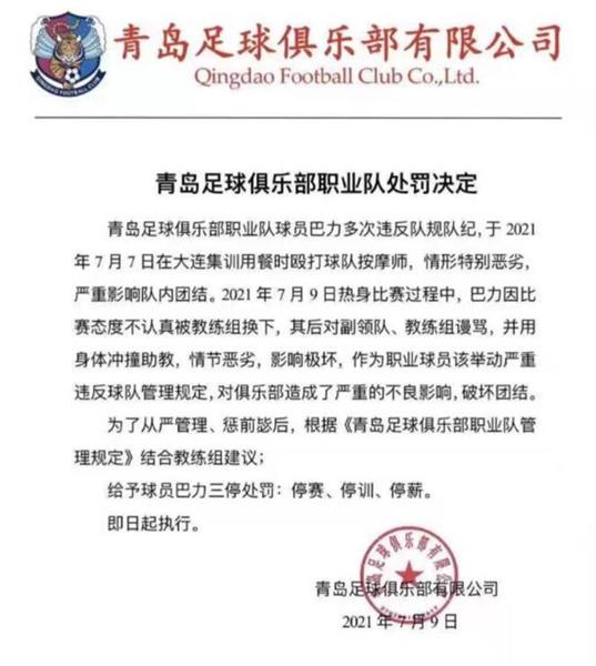 中超青岛队球员巴力被三停 连续违反队规打骂助教