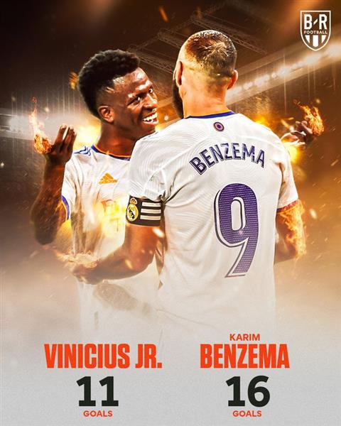 本赛季皇马在西甲14轮联赛打进34球(少赛一场),其中本泽马和维尼修斯这对锋线伙伴就联手打进20球。值得一提的是,本赛季到现在为止,西甲20支球队中只要7支球队的联赛进球数超过20球。可以说33岁的本泽马和21岁的维尼修斯已经成为了一对十分默契的锋线伙伴。2人的赛季进球数则是11和16,适当恐惧!