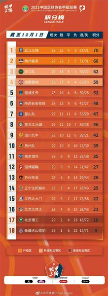 截止12月1日,2021赛季中甲联赛总积分榜如下。