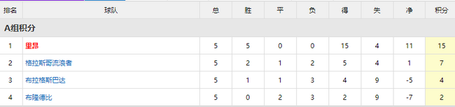 本组里昂5战全胜积15分确定头名提早出线,第二名流浪者即使输球,在布拉格斯巴达赢取3分的基础上,也可以凭仗交兵净胜球的弱小优势坐稳小组第二。
