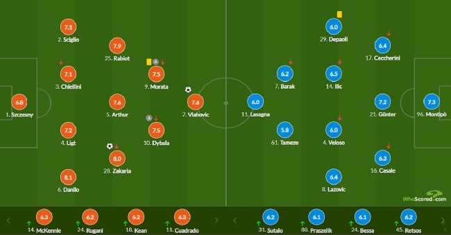 尤文(4-3-1-2):1-什琴斯尼;6-达尼洛,4-德利赫特,3-基耶利尼(75',24-鲁加尼),2-德西利奥;28-扎卡里亚(83',14-麦肯尼),5-阿图尔,25-拉比奥特;10-迪巴拉(75',11-夸德拉多);7-弗拉霍维奇,9-莫拉塔(83',18-基恩)