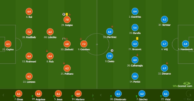 世界米兰(3-5-2):1-汉达诺维奇;37-什克里尼亚尔,6-德弗里,32-迪马尔科(90',33-丹布罗西奥);2-邓弗里斯,23-巴雷拉,77-布罗佐维奇,20-恰尔汗奥卢(84',22-比达尔),14-佩里西奇;9-哲科,10-劳塔罗(83',7-桑切斯)